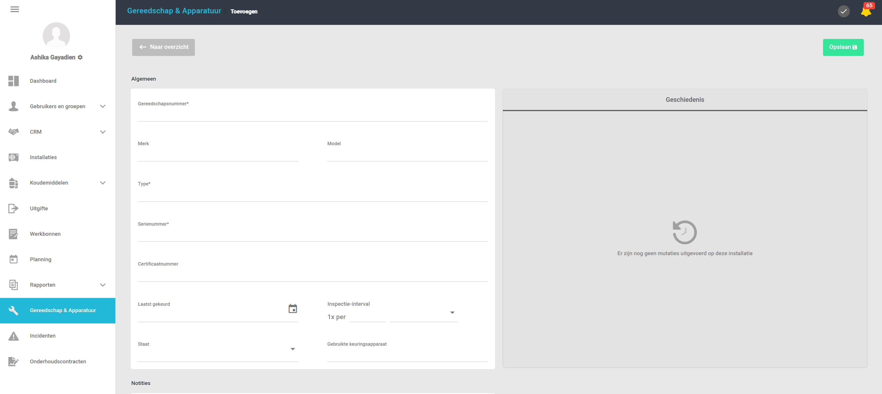 - Ga naar de module Gereedschap en Apparatuur. Hier zie je een overzicht van alle reeds geregistreerde gereedschappen.