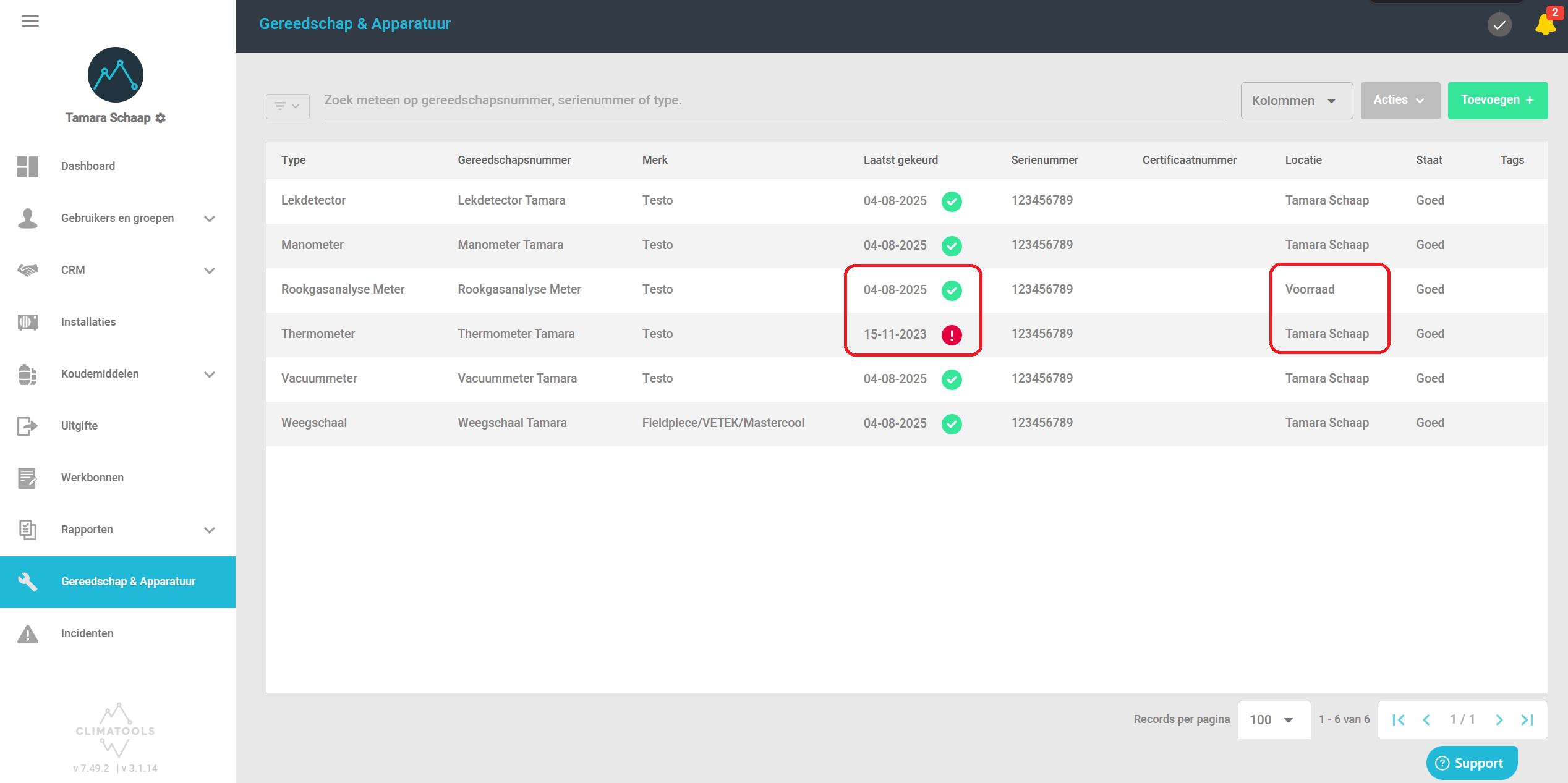 5. Jouw gereedschap komt vervolgens terecht in het overzicht. Hier kun je bijhouden bij welke monteur de gereedschappen zich bevinden en wat de kalibratiestatus is.