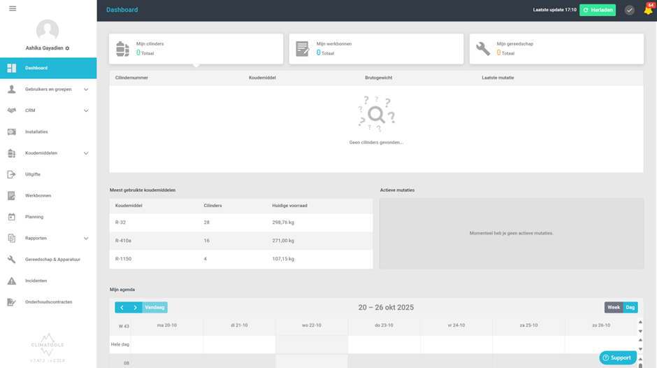 Zodra je inlogt in Climatools met je e-mailadres en het wachtwoord dat je hebt aangemaakt bij het activeren van je abonnement, kom je automatisch terecht op het dashboard.