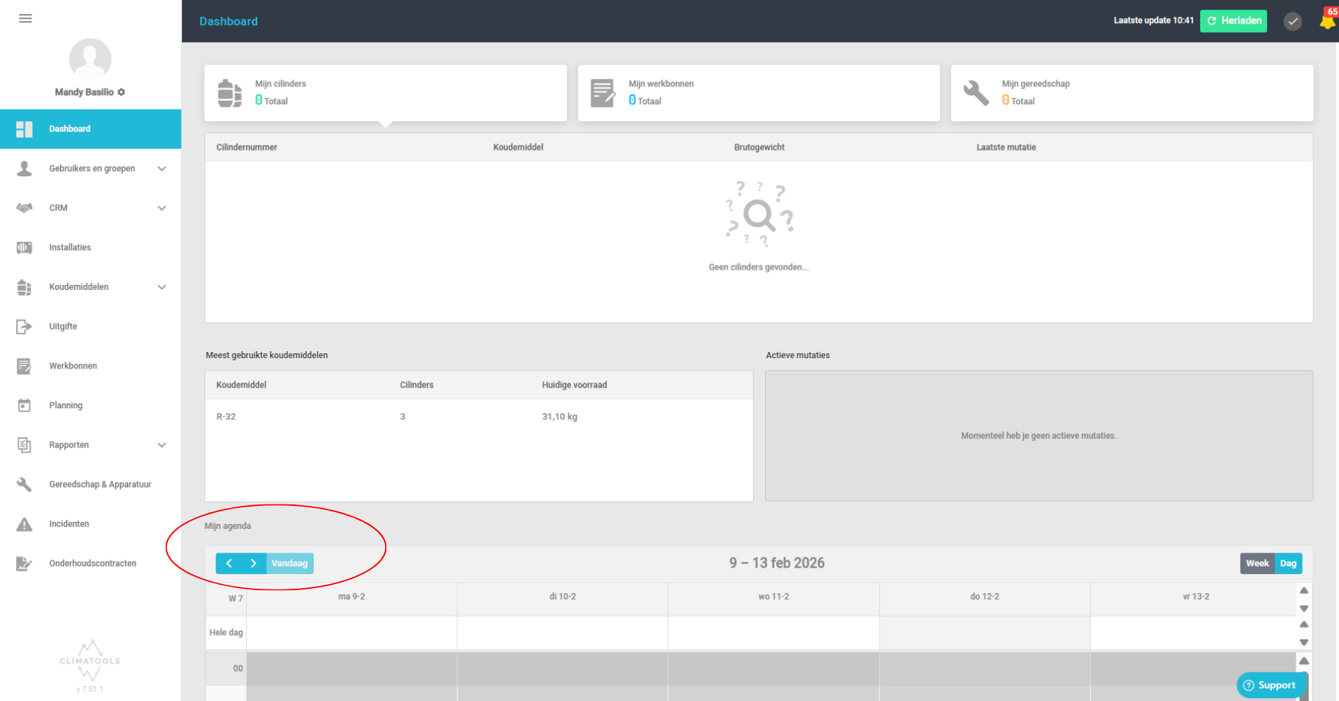 Het dashboard is ontworpen om je snel inzicht te geven in de actuele status van je werkzaamheden en hulpmiddelen, zodat je efficiënt aan de slag kunt. Helemaal onderaan het dashboard vind je je agenda, waarin je eenvoudig jouw planning per dag of per week kunt bekijken.