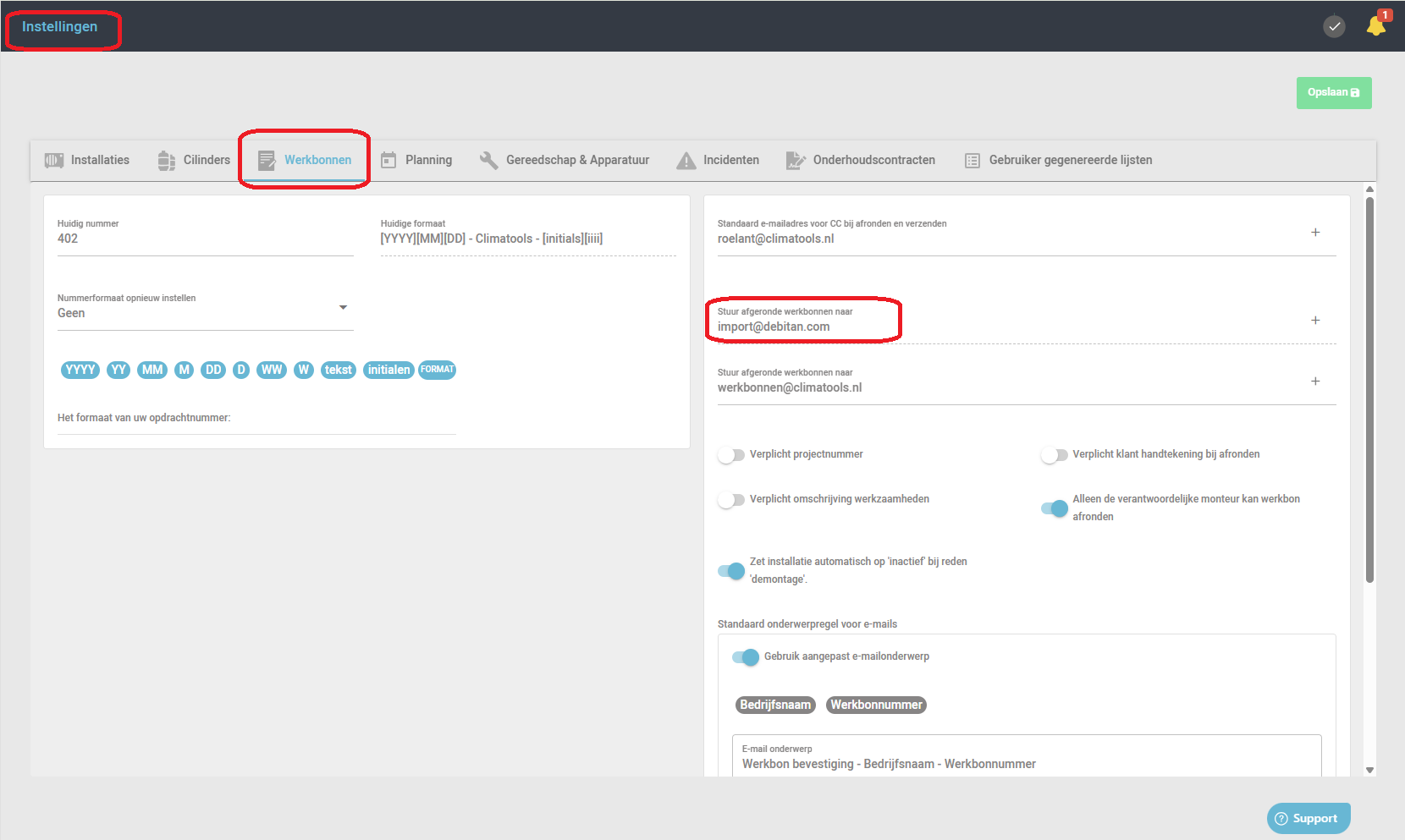 Stel in dat elke afgeronde werkbon automatisch als CC (Carbon Copy) wordt verstuurd naar het importadres van Debitan: import@debitan.com